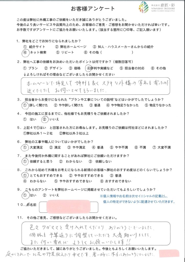 弊社で昨年に施工をさせていただきましたお客様へアンケートを依頼いたしましたところ、続々と回答を頂戴しております。