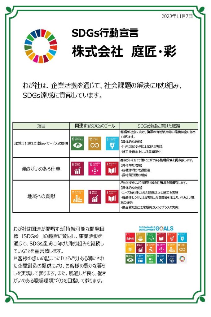 2026.02.09 Topix SDGs行動宣言~株式会社庭匠・彩~ わが社は、企業活動を通じて、社会課題の解決に取り組み、 SDGs達成に貢献しています。 株式会社庭匠・彩は、奈良・大阪を中心とする外構工事・エクステリア・ガーデンの専門家